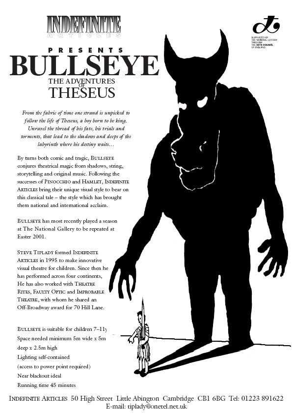 THE ADVENTURES OF THESEUS Directed by Penny Bernand Devised and performed by Steve Tiplady and Sally Brown Music by Ben Park Script advisor Keith Bambury Thanks to Zannie Fraser and Bob Pearce By turns both comic and tragic, BULLSEYE conjures theatrical magic from shadows, string, storytelling and original music INDEFINITE ARTICLES bring their unique visual style to bear on this classical tale - the style which has brought them national and international acclaim. BULLSEYE has played at the Galway Festival, two seasons at The National Gallery and most recently at the Fitzwilliam Museum Cambridge. Marvellously inventive storytelling methods wowing both children and adults. Rosita Boland, Irish Times BULLSEYE is suitable for children 6–11yrs IDEAL FOR KEY STAGE II CHILDREN STUDYING THE GREEKS ![]() |