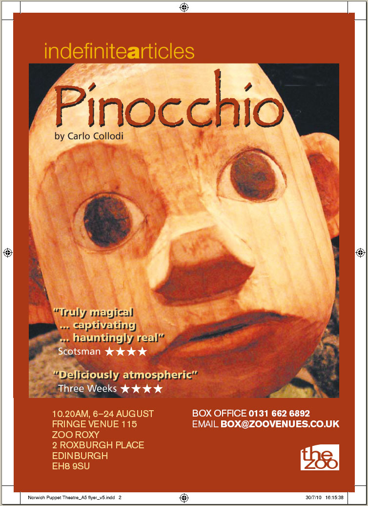 Adapted by Louise Warren from Carlo Collodi Directed by Alex Martin Performed by Steve Tiplady Music by Giles Leaman and Hannah Marshall Edinburgh run Jonathan Lambert and Steve Kettley Steve Tiplady, as Geppetto, uses the objects of a carpenter’s workshop to tell the tale of the puppet that wants to be a real boy, and the puppet-maker who wants to be a real father. Pinocchio is carved on stage, brushes become a fox and the shadow of two saws transforms into a giant shark. An element of improvisation makes each performance unique to its audience. Puppetry, shadows, illusion and especially composed music combine to create a show with something for all ages; it’s inventive, visually and verbally witty with a big heart. “Wonderful work that celebrates the possibilities of theatre” Lyn Gardner, The Guardian “Truly magical…captivating…hauntingly real” The Scotsman For ages 4 and up 60 mins Photo: Adam Crossthwaite To book contact: Scamp Theatre Limited 44 Church Lane Arlesey Bedfordshire UK SG15 6UX tel: +44 (0)1462 734843 mobile: +44 (0)7710 491111 www.scamptheatre.com admin@scamptheatre.com ![]() |